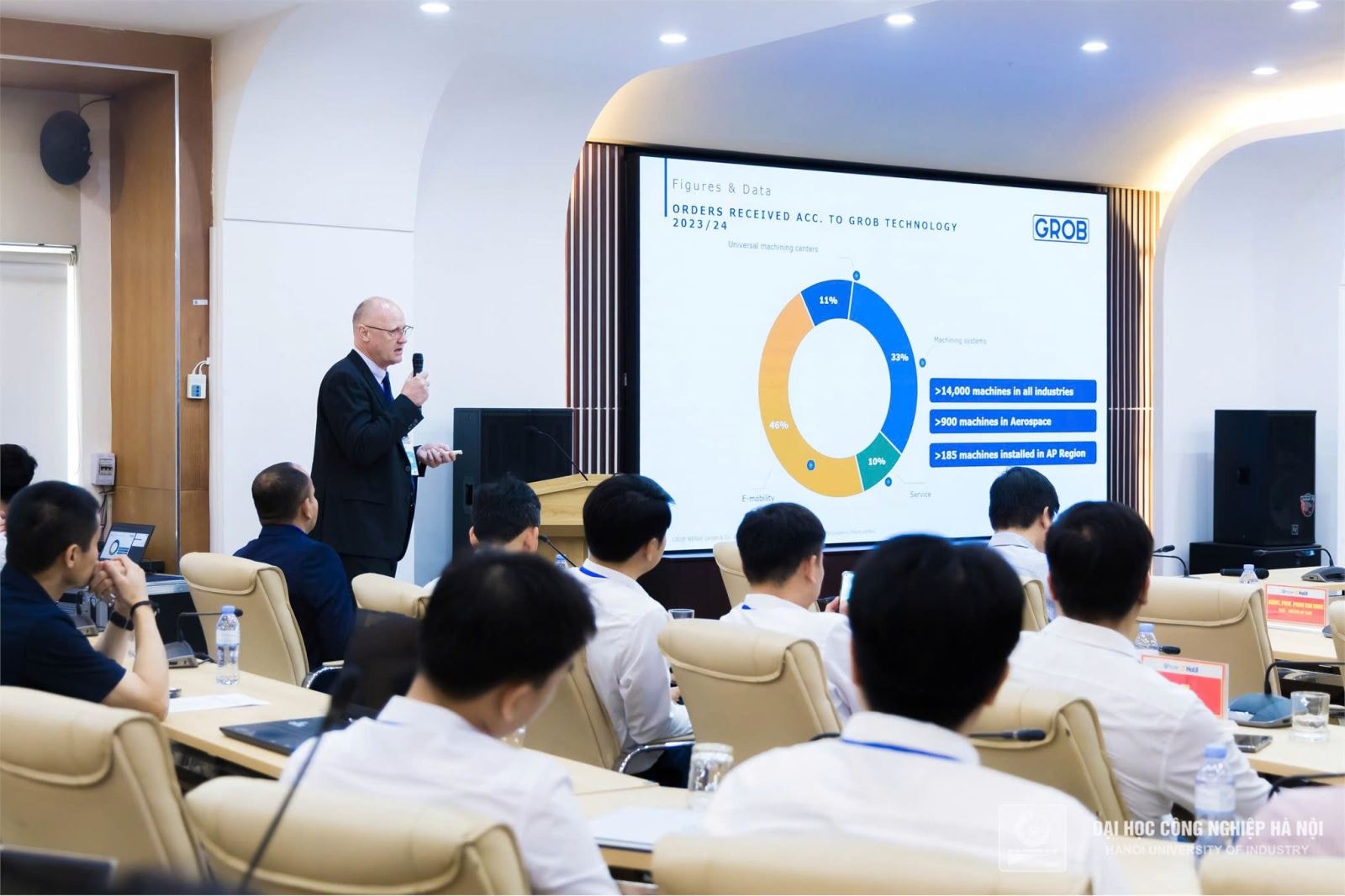 Hội thảo đã diễn ra với nhiều báo cáo chuyên sâu đến từ các chuyên gia quốc tế. Ông Uwe Wedler - Tập đoàn GROB khu vực châu Á - Thái Bình Dương đã trình bày về các phương pháp CNC tiên tiến giúp thúc đẩy quá trình chuyển đổi sang nhà máy thông minh và lĩnh vực di động điện tử. Ông nhấn mạnh vai trò của tự động hóa, công nghệ pin và in 3D kim loại trong tối ưu hóa sản xuất.
