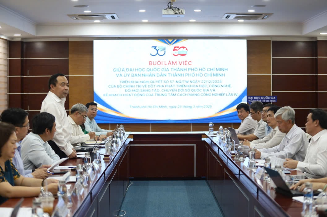 Ngày 25/03/2025, Đại học Quốc gia TP Hồ Chí Minh đã có buổi làm việc với UBND TP Hồ Chí Minh về triển khai Nghị quyết số 57-NQ/TW ngày 22/12/2024 của Bộ Chính trị về đột phá phát triển khoa học, công nghệ, đổi mới sáng tạo và chuyển đổi số quốc gia. Tại buổi làm việc, đại diện lãnh đạo các đơn vị trực thuộc Đại học Quốc gia TP Hồ Chí Minh đã đề xuất, kiến nghị nhiều nội dung xoay quanh việc phối hợp triển khai Nghị quyết số 57-NQ/TW.