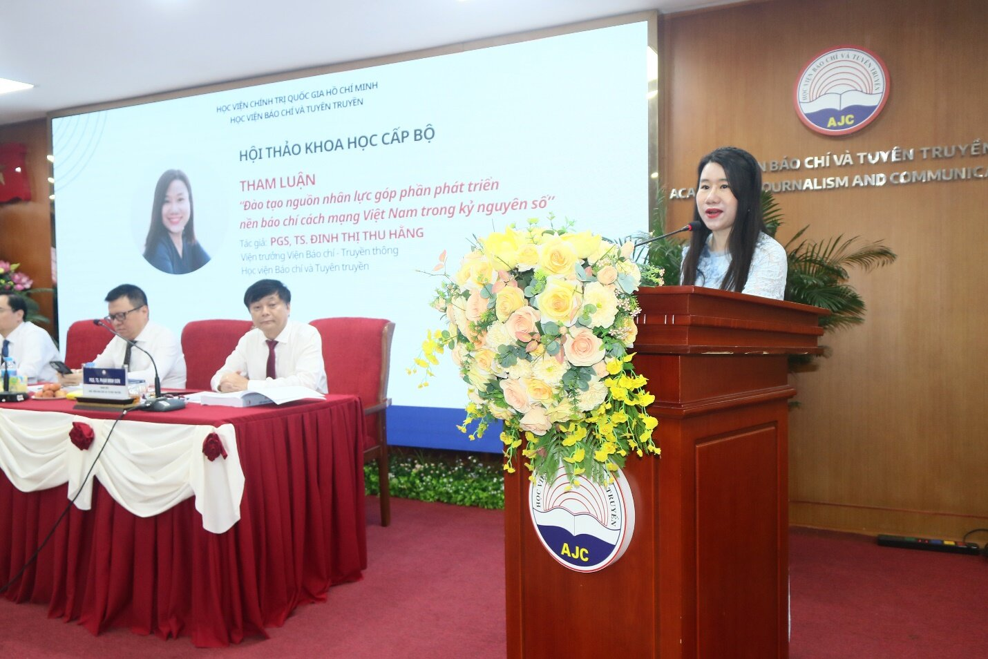 PGS.TS Đinh Thu Hằng - Viện trưởng Viện Báo chí - Truyền thông, Học viện Báo chí và Tuyên truyền chia sẻ tại Hội thảo.