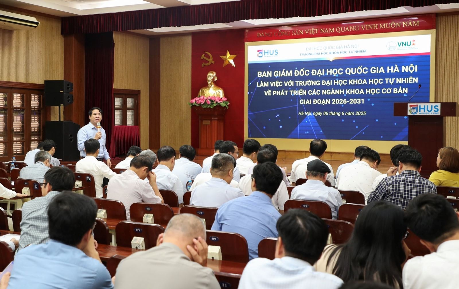 Buổi làm việc là dịp để tập thể Lãnh đạo ĐHQGHN cùng lắng nghe những ý kiến của đội ngũ cán bộ HUS nhằm bàn thảo các giải pháp thúc đẩy hoạt động đào tạo và nghiên cứu khoa học cơ bản của Nhà trường trong bối cảnh có nhiều thách thức về sự tự chủ.