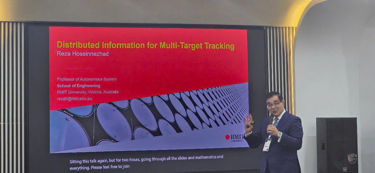 Chia sẻ tại Hội thảo, GS.TS Reza Hoseinnezhad - Đại học RMIT (Úc) đã có báo cáo tham luận về hợp nhất thông tin phân tán cho theo dõi đa mục tiêu. Theo GS.TS Reza Hoseinnezhad, việc theo dõi đa mục tiêu (Multi-Target Tracking) sẽ tập trung vào việc phát triển các thuật toán giúp nhiều cảm biến có thể phối hợp với nhau để theo dõi nhiều mục tiêu một cách phi tập trung, từ đó nâng cao hiệu suất và độ chính xác của hệ thống theo dõi. Nghiên cứu của ông đã phát triển một thuật toán hợp nhất phân tán hiệu quả về mặt tính toán trong mạng cảm biến bằng cách sử dụng bộ lọc Multi-Bernoulli (MB). Thuật toán này áp dụng quy tắc hợp nhất để kết hợp nhiều mật độ tập hợp ngẫu nhiên MB. GS.TS Reza Hoseinnezhad và các đồng nghiệp đã đưa ra một phương pháp xấp xỉ cho mật độ hợp nhất, giúp giảm đáng kể yêu cầu về tính toán và bộ nhớ mà vẫn đảm bảo hiệu suất. Hiệu quả của phương pháp này đã được chứng minh trong các thử nghiệm với tối đa 40 đối tượng.