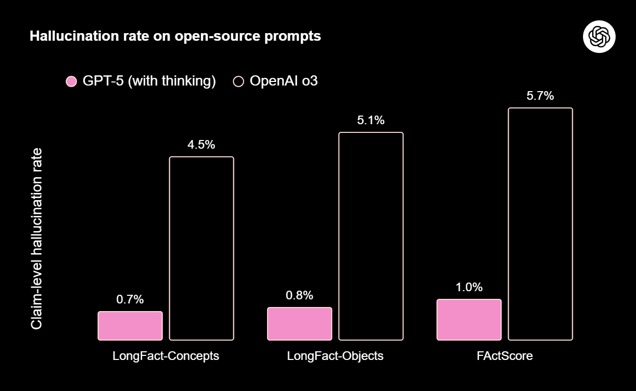 Một trong những cải tiến quan trọng nhất của GPT-5 là việc giảm đáng kể tỷ lệ ảo giác (hallucination). Khi được kết nối Onternet, GPT-5 giảm 45% lỗi thông tin so với GPT-4o, còn trong chế độ suy luận, tỷ lệ này giảm tới 80% so với o3. Trên các benchmark mở như LongFact-Concepts và FActScore, GPT-5 (thinking) chỉ có tỷ lệ hallucination 0,7%1,0% tương ứng, so với 4,5% và 5,7% của o3. [2] [6] [14] [15].