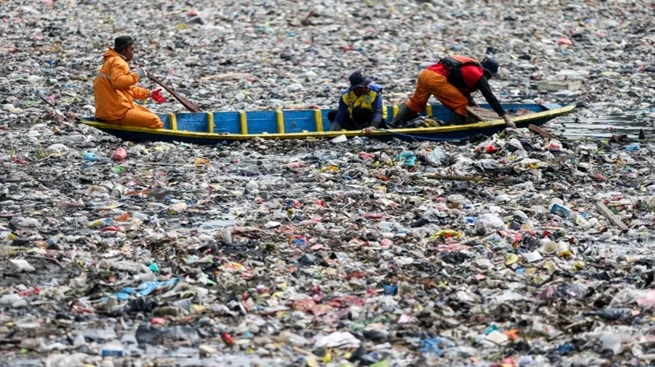 Các nhân viên dọn dẹp rác nhựa trôi nổi trên sông Citarum ở Bandung, Indonesia (nguồn: Ryan Suherlan/NurPhoto/Getty Images).