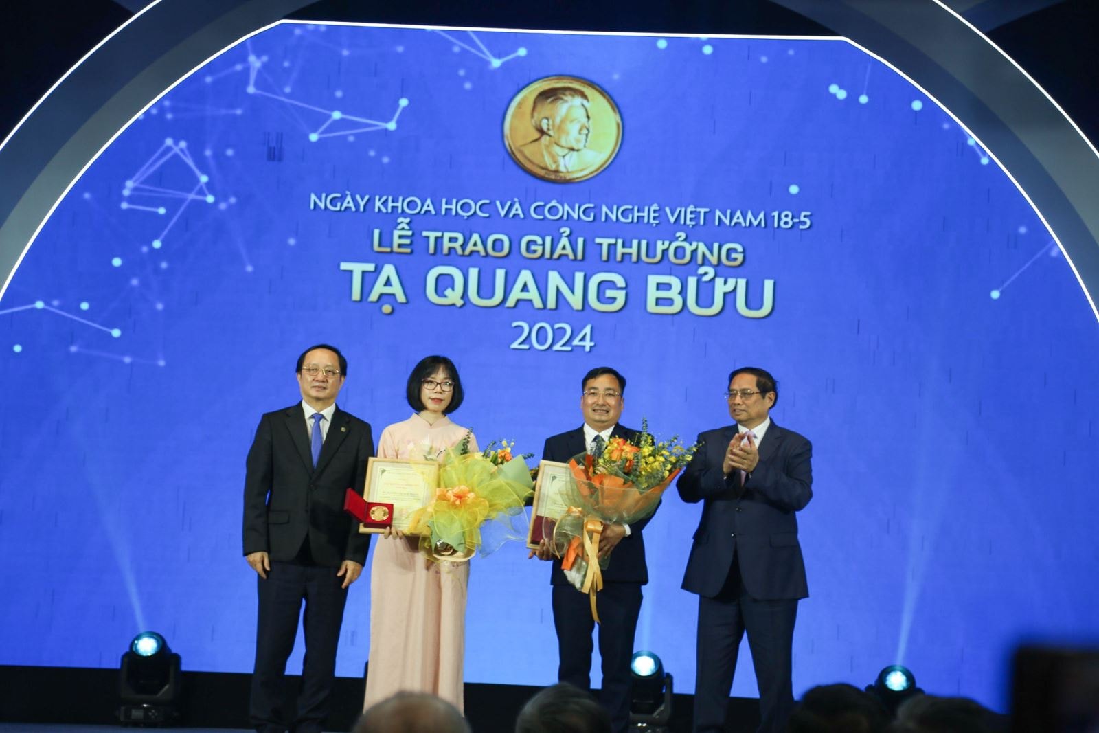 Thủ tướng Chính phủ Phạm Minh Chính, Bộ trưởng Bộ Khoa học và Công nghệ Huỳnh Thành Đạt cùng 2 nhà khoa học đoạt Giải thưởng Tạ Quang Bửu năm 2024.