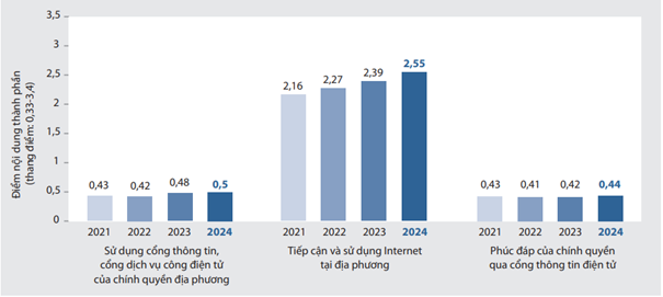 Theo Báo cáo PAPI 2024, công tác quản trị điện tử tiếp tục có bước tiến rõ rệt và trở thành điểm nhấn nổi bật trong toàn bộ bức tranh quản trị công. Trong số 8 chỉ số nội dung được đánh giá, "Quản trị điện tử" ghi nhận mức điểm tăng cao nhất trong giai đoạn 2021-2024 (tăng 0,46 điểm). Đặc biệt, điểm ba chỉ số nội dung thành phần gồm: “Tiếp cận và sử dụng internet ở địa phương”, “Sử dụng cổng thông tin, cổng dịch vụ công điện tử của chính quyền địa phương” và “Phúc đáp của chính quyền địa phương qua cổng thông tin điện tử” đều tăng lên trong năm 2024.