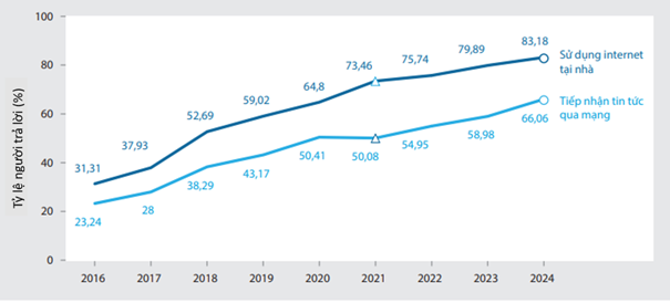 Tỷ lệ tiếp cận tin tức thời sự qua mạng internet và sử dụng internet tại nhà giai đoạn 2016-2024 (nguồn: Báo cáo PAPI 2024).