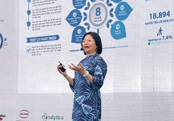 Bà Đỗ Thanh Huyền - Đại diện nhóm nghiên cứu PAPI chia sẻ tại Lễ công bố Báo cáo PAPI 2024 về kết quả nghiên cứu năm 2024 và xu thế 2021-2024 (nguồn: T.L).