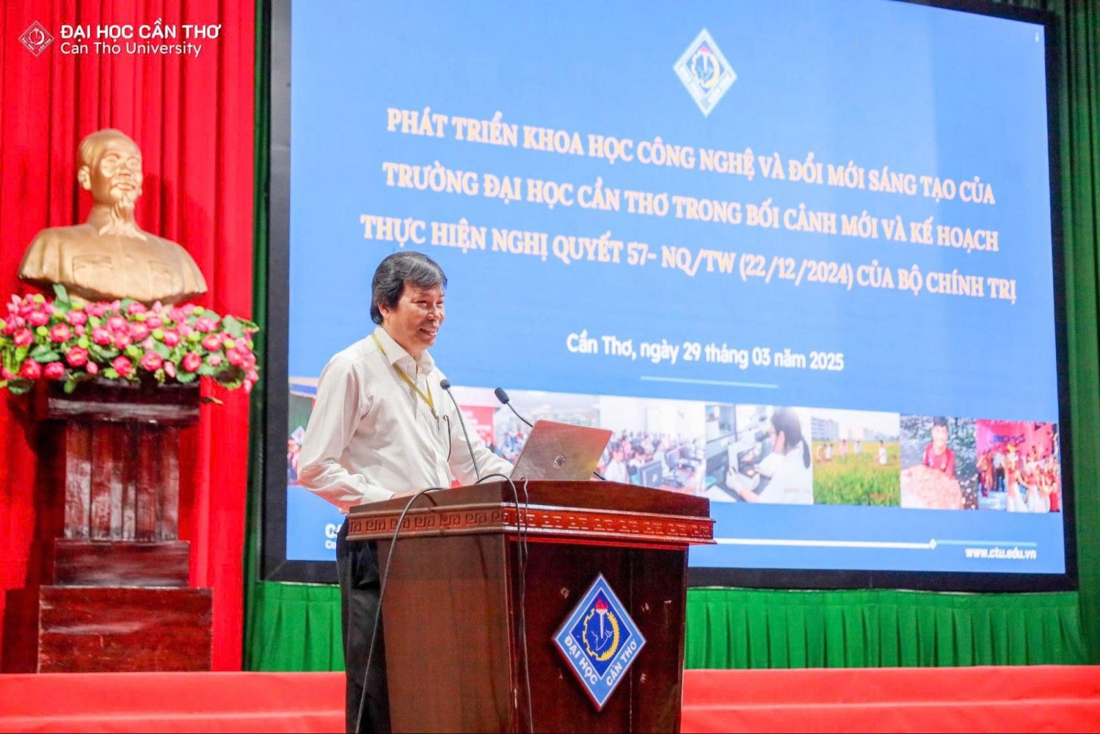 Tại Hội nghị, PGS.TS Nguyễn Chí Ngôn - Phó Chủ tịch Hội đồng Trường Đại học Cần Thơ, Trưởng Ban Tuyên giáo và Dân vận Đảng ủy Trường Đại học Cần Thơ triển khai Nghị quyết số 57-NQ/TW ngày 22/12/2024 của Bộ Chính trị về đột phá phát triển S.T.I.D quốc gia; đồng thời quán triệt các nội dung cốt lõi của Nghị quyết số 57-NQ/TW, đặc biệt là những giải pháp đột phá trong phát triển S.T.I.D quốc gia.