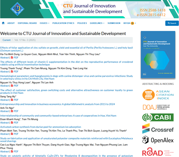 CTU Journal of Innovation and Sustainable Development là tạp chí có quy trình phản biện kín hai chiều nghiêm ngặt, tập trung vào các lĩnh vực đổi mới sáng tạo và phát triển bền vững, bao gồm: công nghệ kỹ thuật, khoa học máy tính, khoa học sự sống, kinh tế - quản lý và giáo dục. Với chất lượng học thuật cao, đội ngũ biên tập quốc tế và quy trình phản biện chặt chẽ, CTU Journal of Innovation and Sustainable Development là một trong những Tạp chí được Lãnh đạo Nhà trường đặc biệt quan tâm, nhằm đẩy mạnh hoạt động công bố nghiên cứu cho cộng đồng các nhà khoa học trong và ngoài nước.