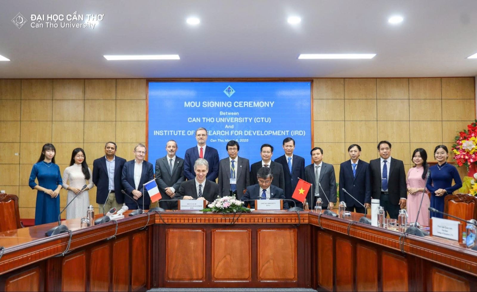 Ngày 08/03/2025, tại Cần Thơ, dưới sự chứng kiến của Đại sứ Đặc mệnh toàn quyền Cộng hòa Pháp tại Việt Nam Olivier Brochet, PGG.TS Trần Trung Tính - Hiệu trưởng Trường Đại học Cần Thơ và TS Sylvain Ouillon - Trưởng Đại diện Viện Nghiên cứu Phát triển (IRD) của Pháp tại Việt Nam đã ký kết Biên bản ghi nhớ hợp tác (MoU). Biên bản ghi nhớ hợp tác nhằm chia sẻ thông tin, thúc đẩy các hoạt động nghiên cứu, đào tạo, tư vấn trong các lĩnh vực như: khoa học môi trường, thích ứng và giảm thiểu biến đổi khí hậu, nông nghiệp và nuôi trồng thủy sản, khoa học xã hội, công nghệ và kỹ thuật...