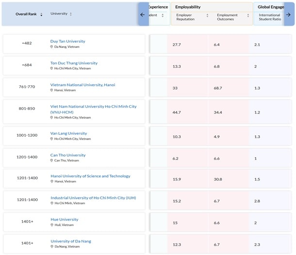 Trong kỳ xếp hạng QS WUR 2026, 10 cơ sở giáo dục đại học của Việt Nam được xếp hạng là: 1) Đại học Duy Tân (482), 2) Trường Đại học Tôn Đức Thắng (684), 3) Đại học Quốc gia Hà Nội (ĐQGHN) (761-770), 4) Đại học Quốc gia TP Hồ Chí Minh (801-850), 5) Trường Đại học Văn Lang (1001-1200), 6) Trường Đại học Cần Thơ (1201-1400), 7) Đại học Bách khoa Hà Nội (1201-1400), 8) Trường Đại học Công nghiệp TP Hồ Chí Minh (1201-1400), 9) Đại học Huế (1401+), Trường Đại học Đà Nẵng (1401+).