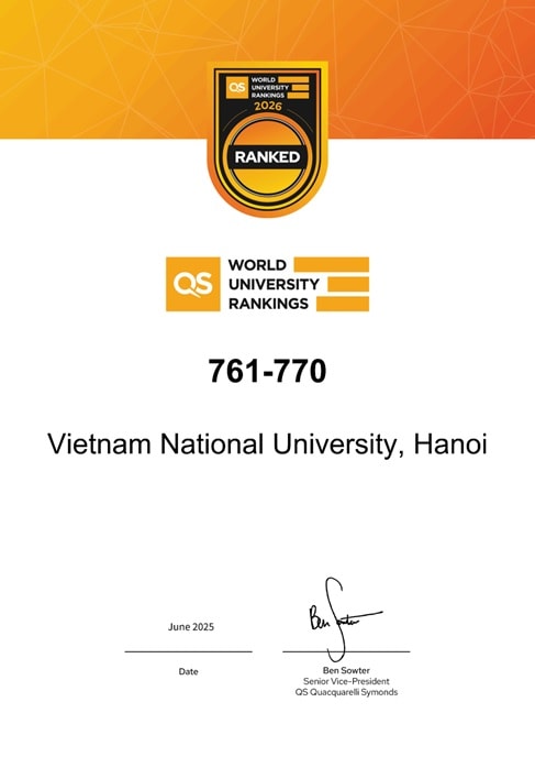 Chứng nhận kết quả xếp hạng thuộc nhóm 761-770 cơ sở giáo dục đại học tốt nhất thế giới trong QS WUR 2026 của Đại học Quốc gia Hà Nội.